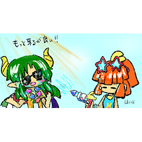 ちびラグをぷよの上に乗せたらかわいいんじゃないかと思って描きました。ぷよは目潰しくらって怒っています。