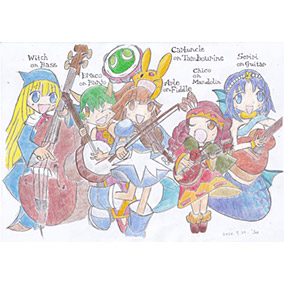 ぷよぷよ~んの牧歌的な雰囲気のオープニングからブルーグラスを連想したので、アルルと仲間たちでバンド編成してみました。各メンバーと担当楽器は絵に描いてある通りです。偶然にもイラストを描き下ろした日はアルルの誕生日でした。