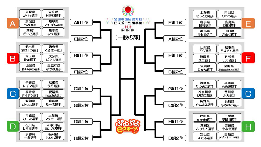 | 大会名 | いきいき茨城ゆめ国体2019 第74回国民体育大会 文化プログラム 「全国都道府県対抗eスポーツ選手権 2019 IBARAKI」 『ぷよぷよeスポーツ』の部 本大会 主催:いきいき茨城ゆめ国体・いきいき茨城ゆめ⼤会実⾏委員会・⼀般社団法⼈ ⽇本eスポーツ連合 協力:株式会社セガゲームス |