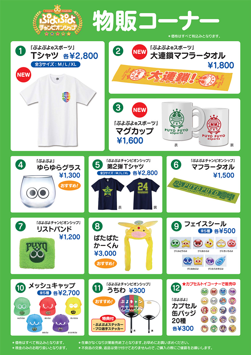 11月に開催された「ぷよぷよカップ SEASON2 11月大会」で大人気だった「ぱたぱたかーくん」をはじめ、「Tシャツ」、「大連鎖マフラータオル」、「マグカップ」といったラインナップを販売予定です。在庫がなくなり次第販売終了となりますので、お早めにお買い求めください。物販は、受付開始と同時の12時より開始いたします。