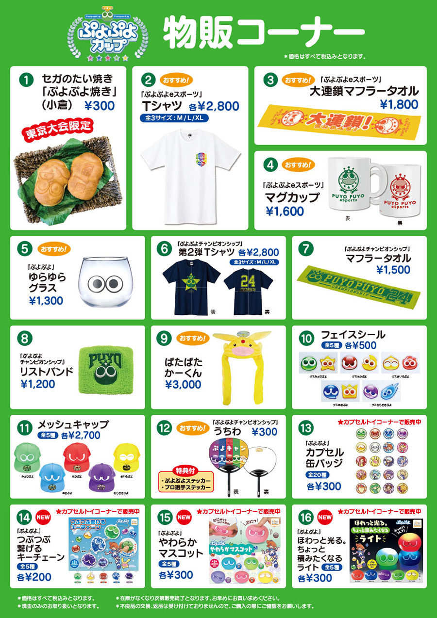 東京・大阪の各大会会場で物販を行います。今回はコラボ出店として、東京会場限定「セガベース出張店」と、大阪会場限定「ぷよぷよ茶屋出張店」が登場します。各大会会場限定商品として、東京会場では<セガのたい焼き「ぷよぷよ焼き(小倉)」>の販売、大阪会場ではぷよぷよをテーマにしたコラボ日本酒やカクテル、お菓子などの販売を行います。観戦前にも物販の購入は可能です。なくなり次第終了となりますので、お早めにお買い求めください!