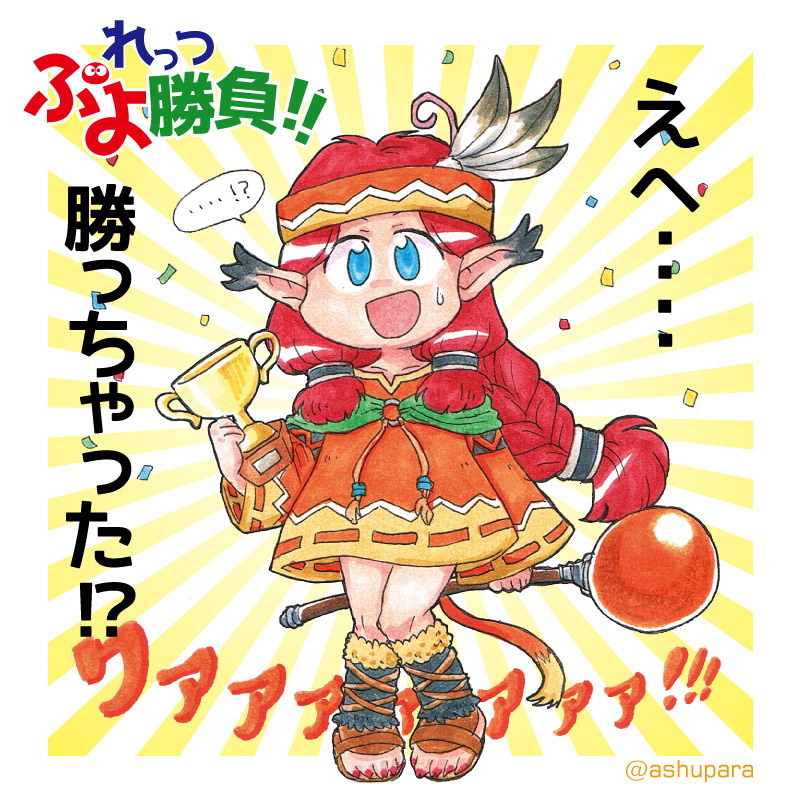 ぷよぷよ~んのチコのイラスト描きました。うっかり大会で優勝しちゃって、いつもの「えへっ勝っちゃった♪」のセリフが戸惑ってしまってる感じです。チコといえば空中都市ステージBGMやたらかっこいいですよね!!!ぷよシリーズはほんとキャラクターの魅力もそうなんですが、BGMが、ほんと、、、好きです。