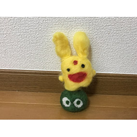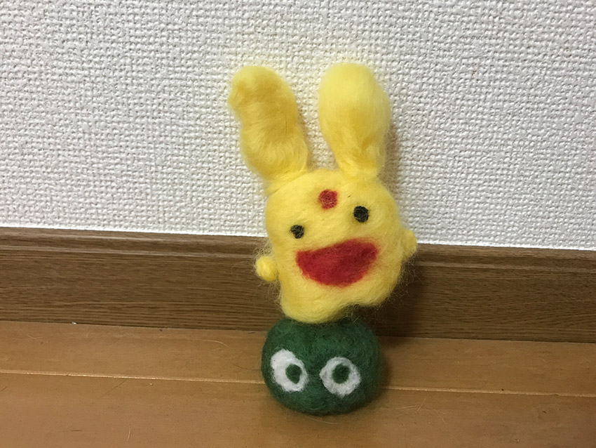 羊毛フェルトでつくったカーバンクルちゃんと緑ぷよです。