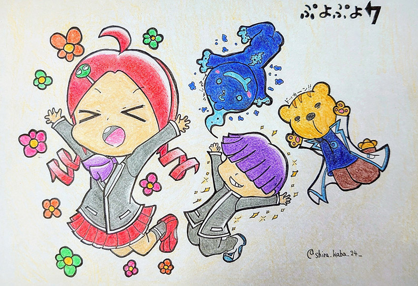 りんごちゃん達がぷよぷよ7の衣装を着てるのを見て落書きをしたくなり落書きしました。後...ぷよクエ7周年おめでとうございます!