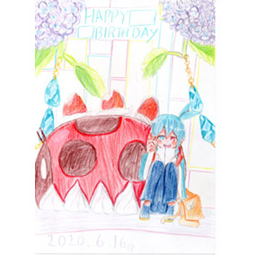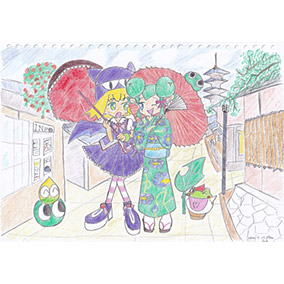 初投稿です。「和洋折衷」をテーマに鉛筆と色鉛筆で仕上げました。アミティにはおしゃれな衣装を、リデルには浴衣を着せ、和傘を持たせました。浴衣のデザインはカタログ等を参考に描きました。背景には八坂の塔が見える京都の街角を引用しました。