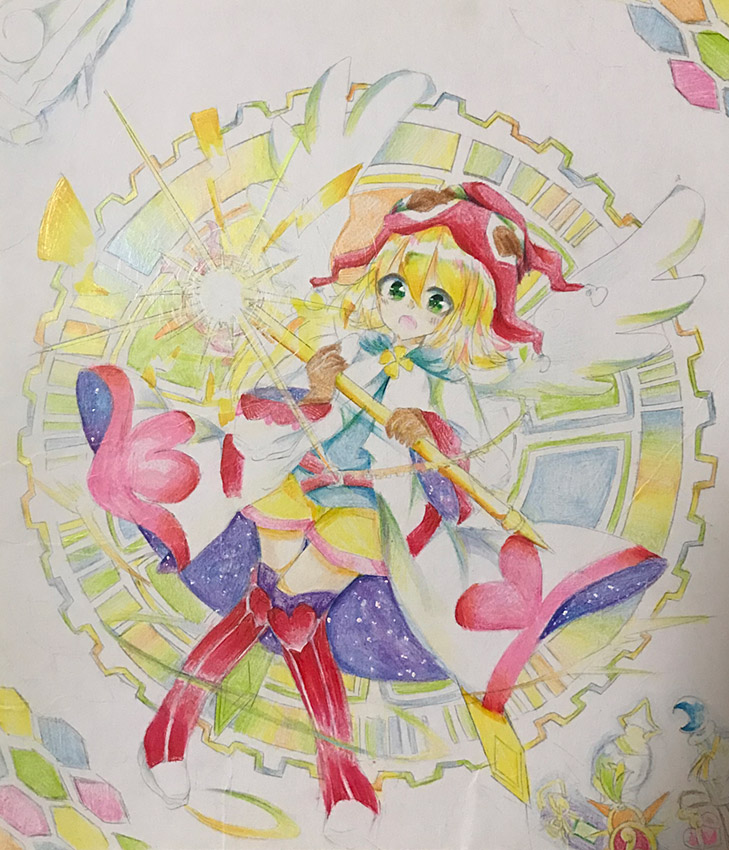 色を重ねたり、影を作ったりしました。元気なサタンのポーズや後ろのアルルとルルーの表情を工夫しました。