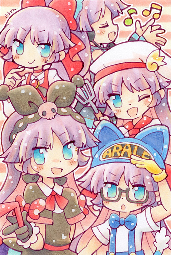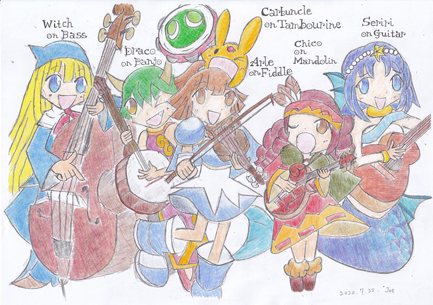ぷよぷよ~んの牧歌的な雰囲気のオープニングからブルーグラスを連想したので、アルルと仲間たちでバンド編成してみました。各メンバーと担当楽器は絵に描いてある通りです。偶然にもイラストを描き下ろした日はアルルの誕生日でした。