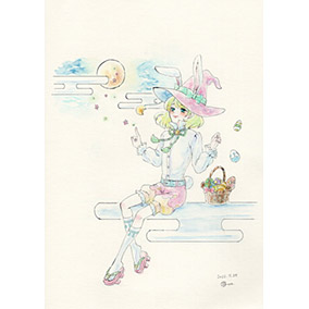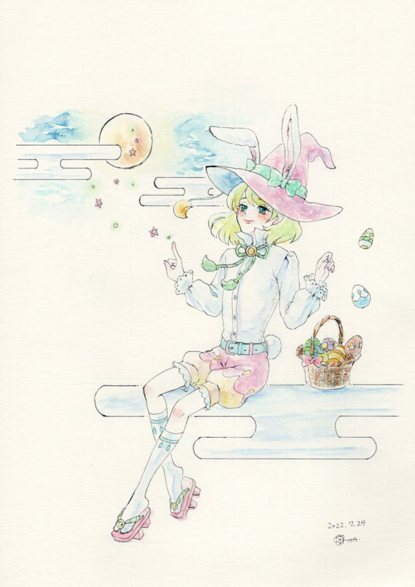 月見とイースターをまぜまぜしました。お月見をする兎ローザッテ先生です ♥ 籠のイースターエッグには、教え子達の色を使ってみました~