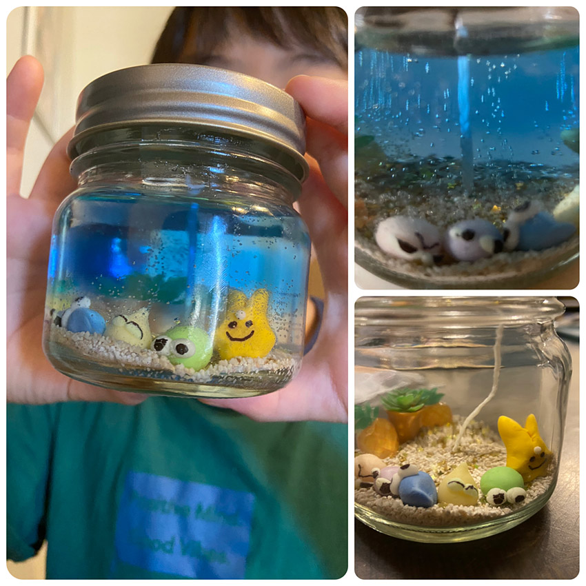夏休みの自由制作でぷよ達が浜辺でバカンスしている様子のジェリーキャンドルを作りました!
