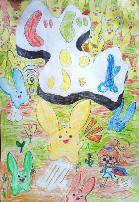グーちゃん(カーバンクル)をたくさんかきました。色ちがいがいっぱいです。(子どもの作品です)