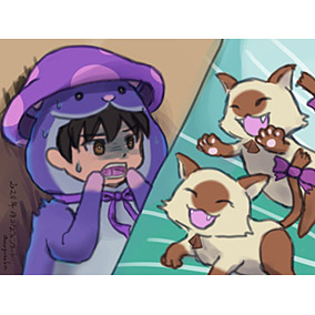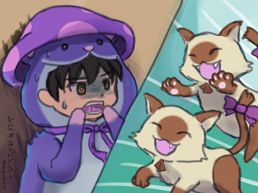 双子のケット・シーにビビってる勇者ハムナスを描きました。ハムタスのラグナスがハムスターサイズなのか、175cmサイズなのか、それともヌートリアサイズなのかわからないのですが、全サイズかわいいからOKです。