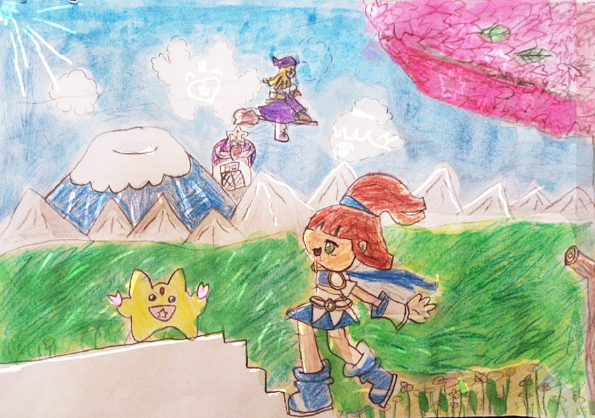 カーバンクルとアルルが桜の花びらを見つけました。遠くにウィッチもいます。