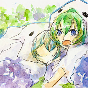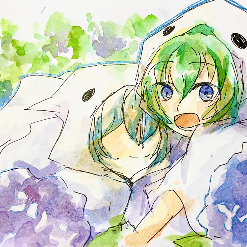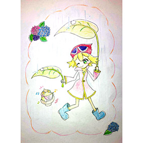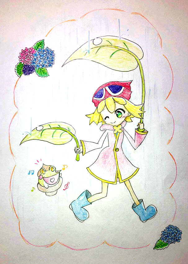 6月といえば梅雨なので雨の中で葉っぱの傘を一緒にさして歩いているアミティとどんぐりガエルをかいてみました。梅雨らしさをだしたかったから、紫陽花も足しました。雨の日でも、ぷよぷよがあれば毎日とっても楽しいです!