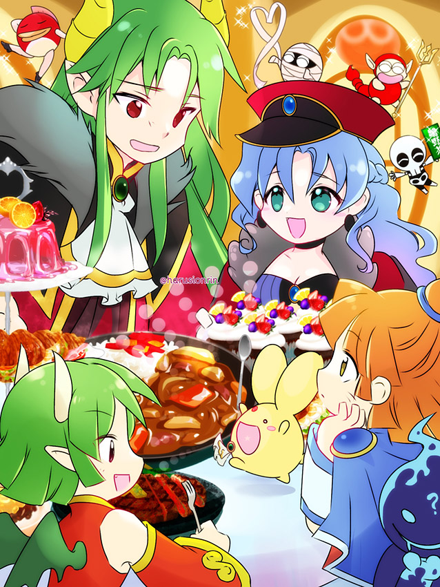 ぷよクエの闇の姫君ルルーさまとサタン様(とカーくん)のお揃いコーデがお似合いですごく良かったです!イベントストーリーの後日譚のパーティーをイメージして描いてみました。これからもいろんなキャラのペアルックなカードが登場するとますますぷよクエが楽しくなりそうですね。