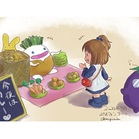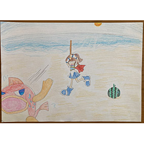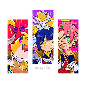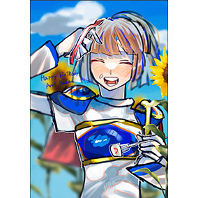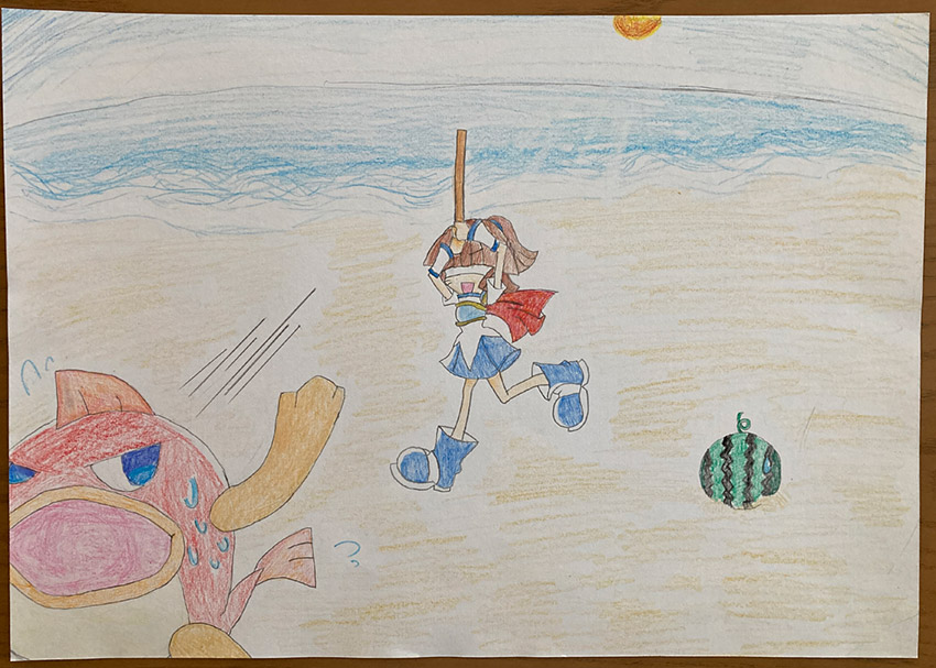 今月はアルルがスイカ割りをしている絵を描きました。暑いことがわかるように、海の上にキラキラしている太陽の光を入れました。もう6月でかなり暑いけど、私のぷよぷよ愛のほうがずっと熱いです!