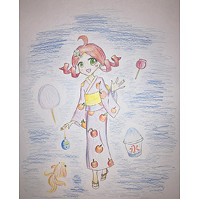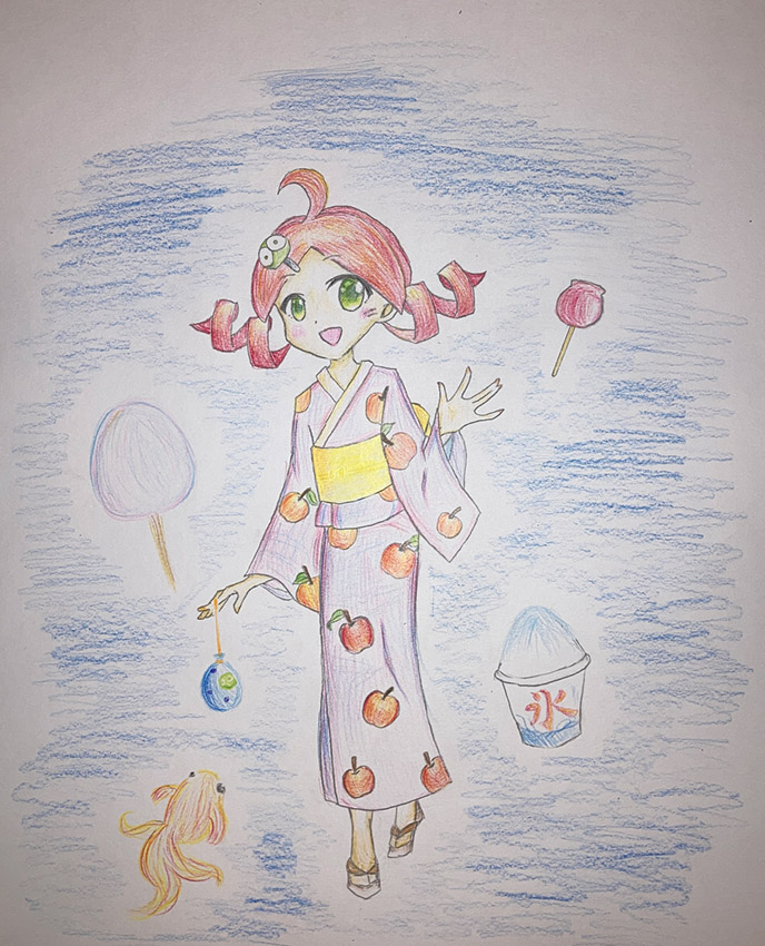 今月は浴衣を着ているりんごを描きました。いつもとちょっと違う塗り方で色塗りをしてみました。私も浴衣を着て夏祭りに行きたいです!