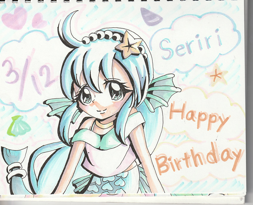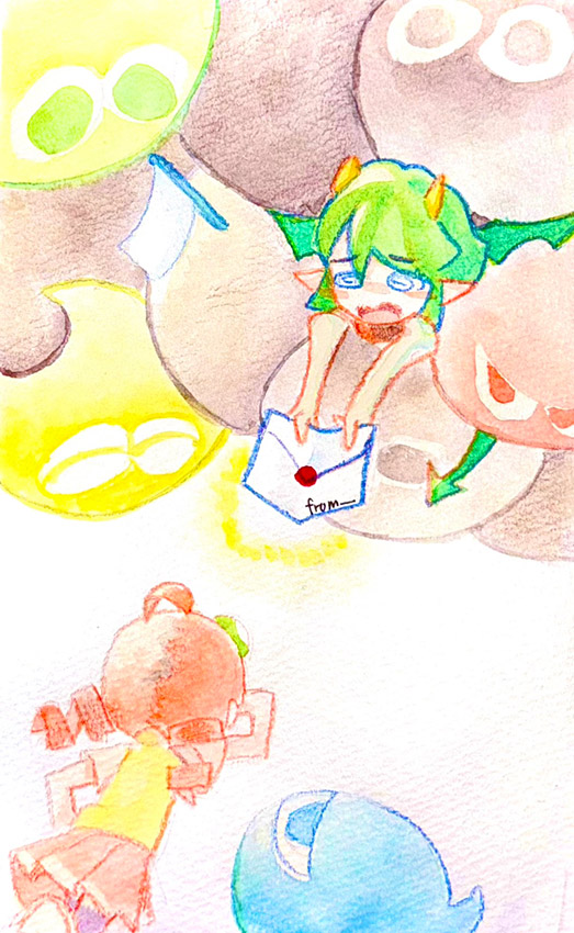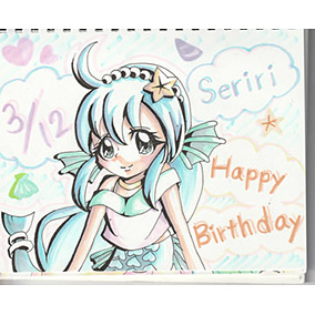 セリリ、誕生日おめでとう!いつもと違う絵柄で頑張りました!私はもうすぐ小学校を卒業しますが、ぷよぷよを卒業する時は多分一生来ません(笑)中学生になってもぷよぷよが私の心の大きな支えです。これからも応援、続けさせてください。ゲームの方も、キャラクターやストーリの方も、ずっと大好きです!