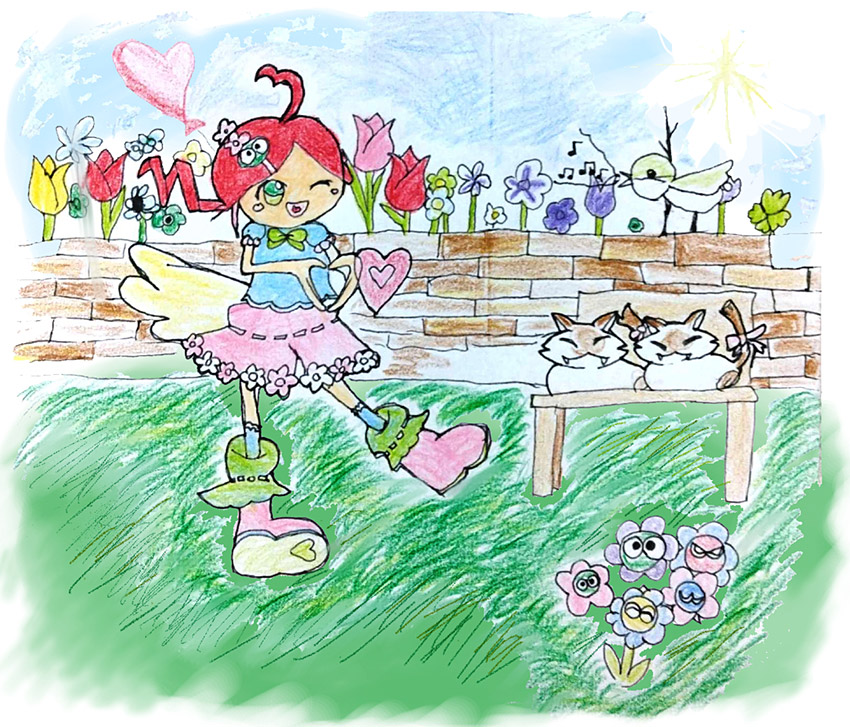 春の絵を描きました。ふたごのケットシーがベンチに座っています。ぷよぷよのお花も咲いています。