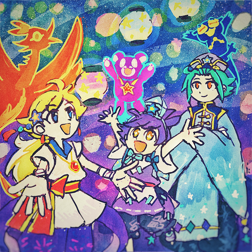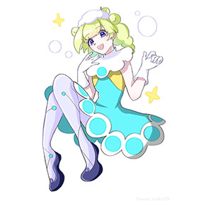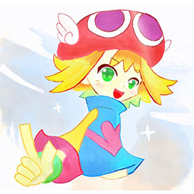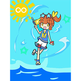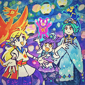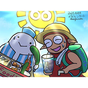 夏の海のさそりまんとパララです。そして後ろに輝く太陽ぷよ。熱中症対策にまどうみずやキュウリ、焼きそばなんかを売り歩いています。