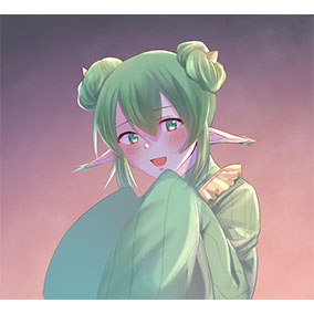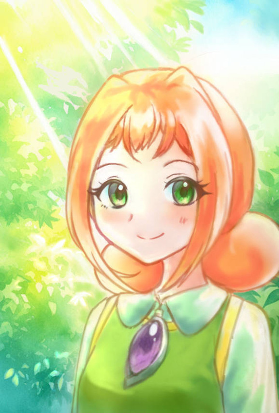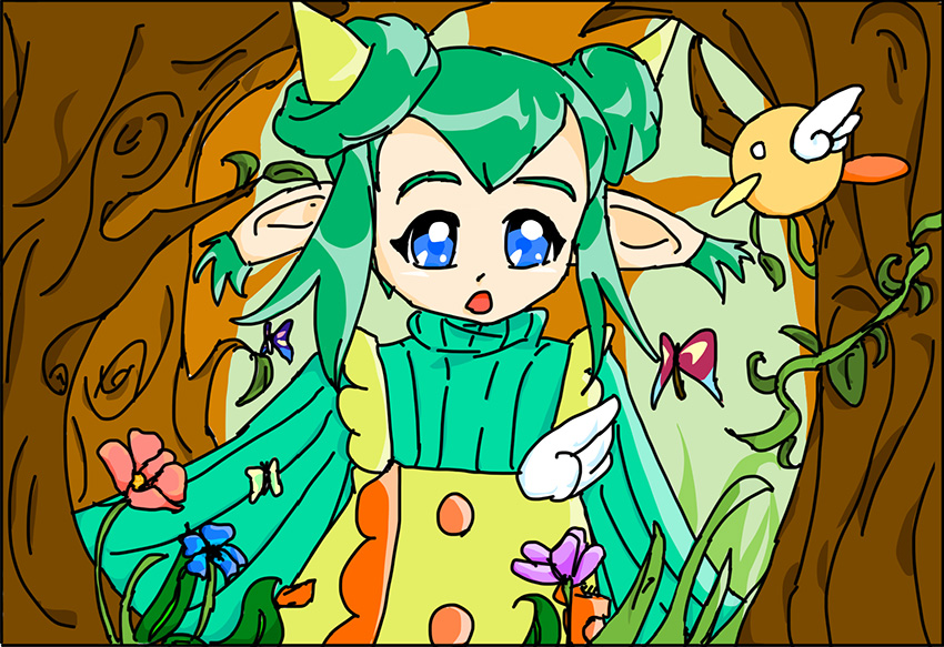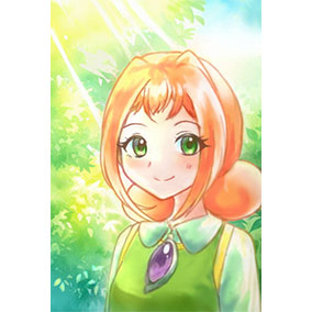 アリィを描きました。アリィは服や目の草木のような緑色や、髪の陽だまりのようなオレンジ色から、木漏れ日が良く似合うと思います。