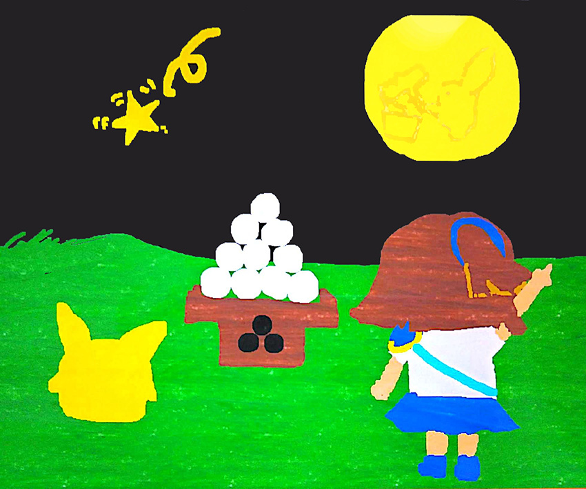 うしろすがたで月を見ているアルルとかーくんです。月の中にもかーくんがいます。
