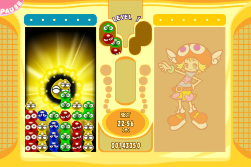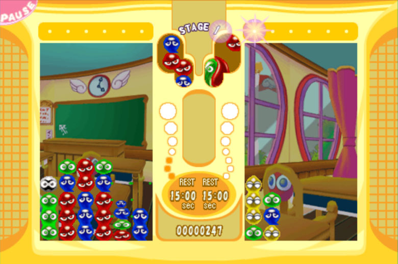 ぷよぷよの基本ルールはそのまま、「相殺」するたびにたまるフィーバーゲージを満タンにすると、「フィーバーモード」に突入。 連鎖のタネをうまく消すことで、初心者でも簡単に大連鎖の爽快感やかけひきが味わえる。