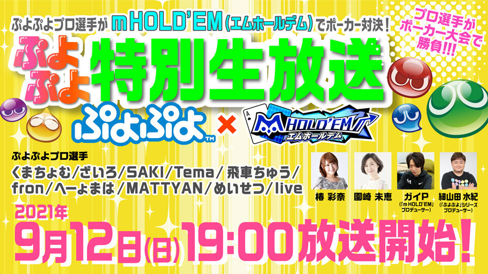 サミー株式会社のスマートフォン向けテキサスホールデムポーカーアプリ『m HOLD’EM(エムホールデム)』の公式生放送「ぷよぷよeスポーツ特別生放送~プロ選手がポーカー大会で勝負!~」にぷよぷよのプロ選手10名と細山田水紀(「ぷよぷよ」シリーズ総合プロデューサー)が出演。