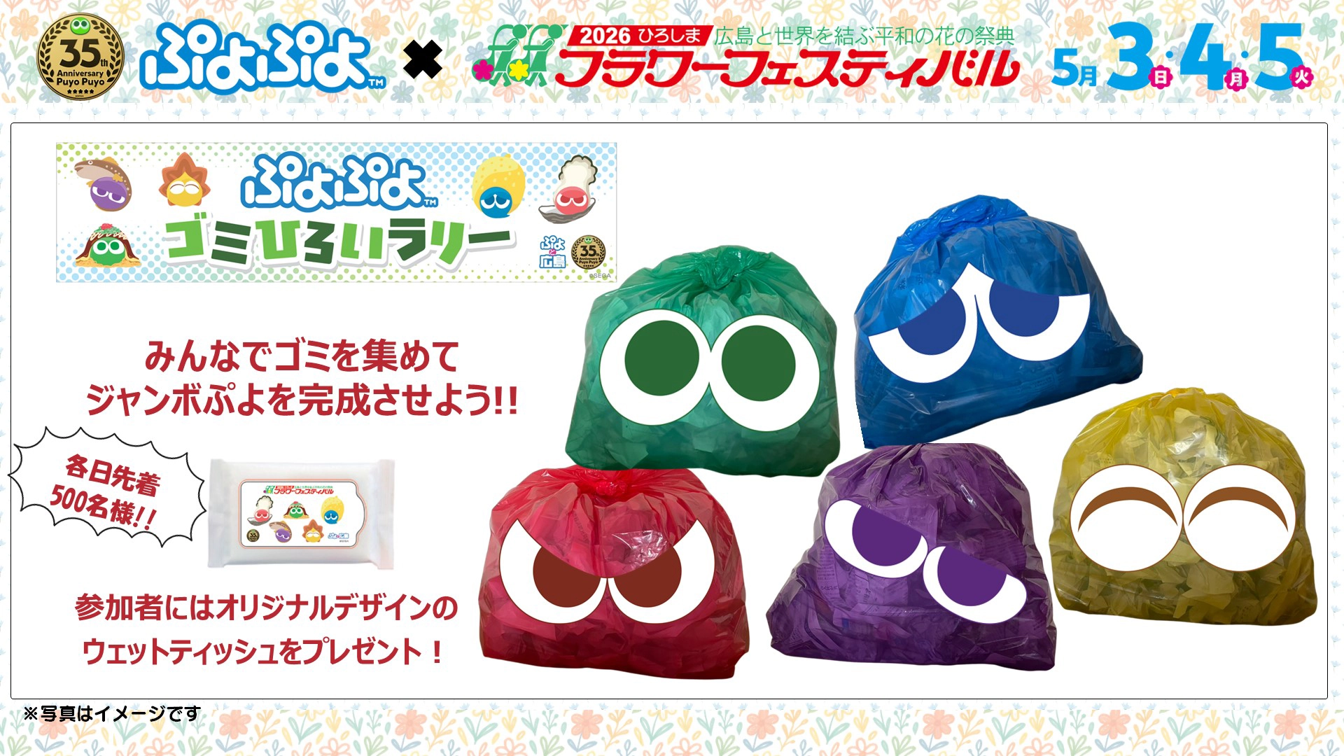 参加していただいた方には、各日先着500名様に広島ぷよとフラワーフェスティバルがコラボしたオリジナルウェットティッシュをプレゼントいたします。