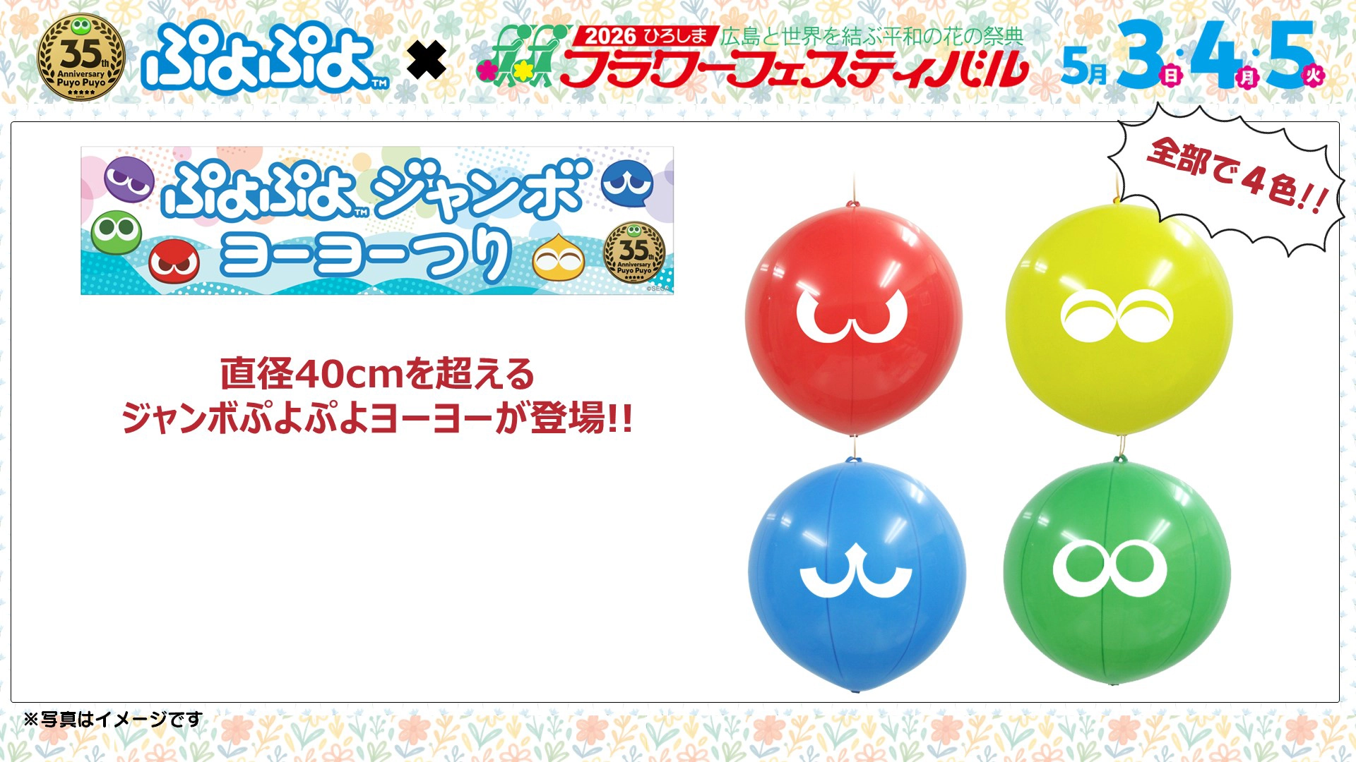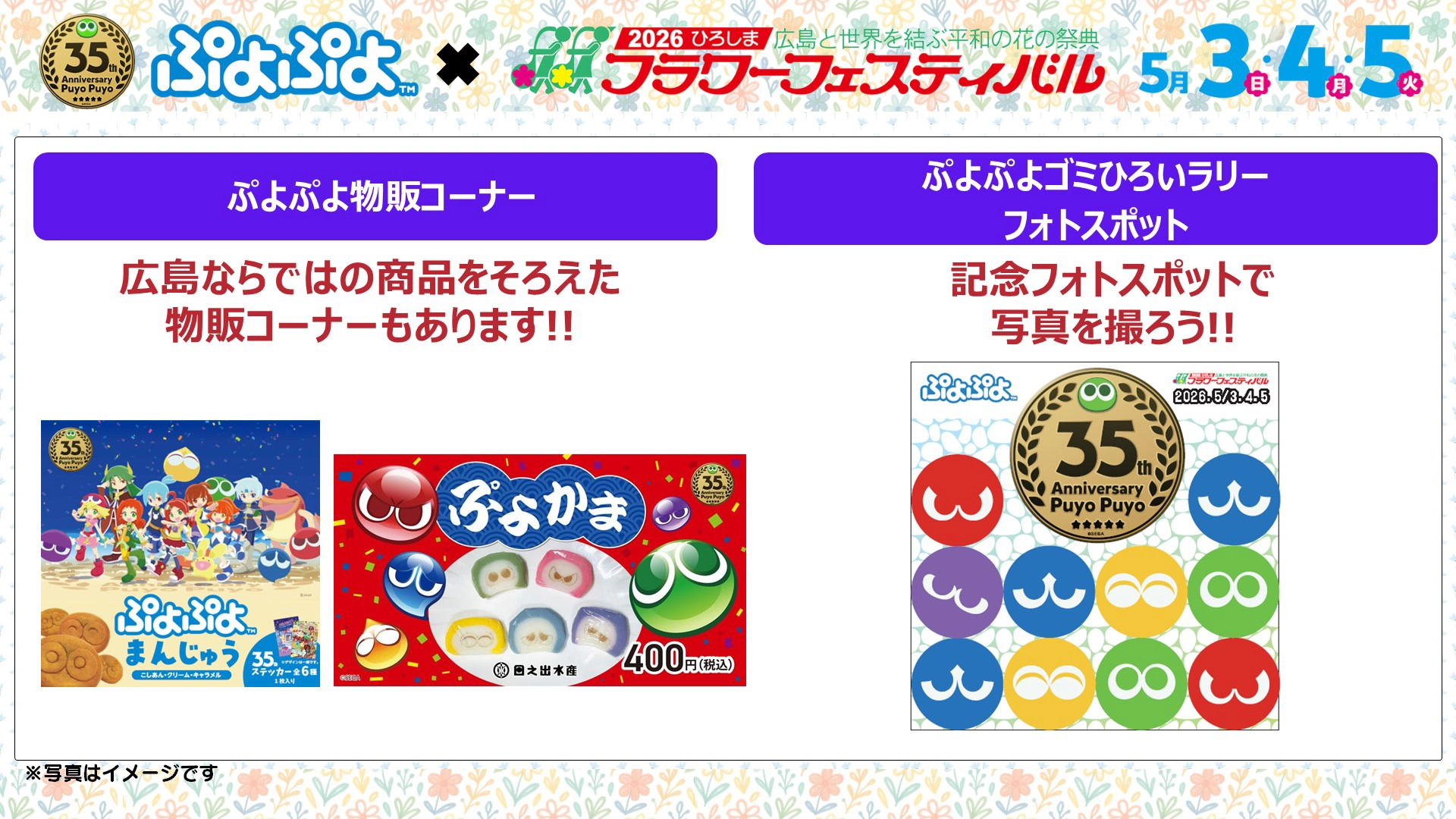 ほかにも、「ぷよぷよ35周年記念グッズ」の販売コーナーや、イベントの思い出を残せる記念フォトスポットもご用意しています。フラワーフェスティバルにお越しの際は、ぜひ「ぷよぷよ 広島パーク」へ遊びに来てくださいね!