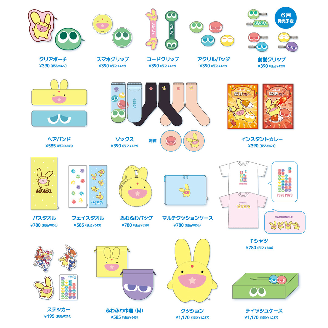 390円(税込429円)を中心としたかわいいアイテムが集まるショップ「サンキューマート」とコラボした『ぷよぷよ』の限定アイテムを5月中旬より入荷順次販売開始します。