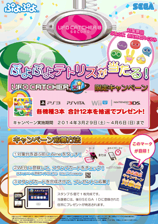 | 内容 | キャンペーン対象景品「ぷよぷよ 低反発ぬいぐるみ」が入っている『UFO CATCHER×i』搭載機をAimeカード (もしくは「おサイフケータイ®」)を使用して5回プレイする毎に、抽選で12名様にゲームソフト『ぷよぷよテトリス』が当たるキャンペーンに1回応募ができます。