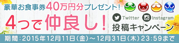 12月11日(金)~12月31日(木)の期間中、スマートフォンアプリ『ぷよぷよ!!クエスト』と、株式会社アンジーの写真加工アプリ「Pico Sweet(ピコ・スウィート)」とのコラボ企画「4つで仲良し!キャンペーン」を開催いたします。