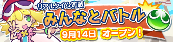 9月14日(水)11:00より、スマートフォンアプリ『ぷよぷよ!!クエスト』に、新しいバトル「みんなとバトル」が登場!