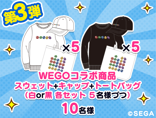 『ぷよぷよ!!クエスト』公式twitterアカウントをフォローし、該当ツイートをRTしてくださった方の中から抽選で10名様に「セガ×WEGOコラボ スウェット+キャップ+トートーバック」をプレゼント!