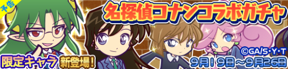 | 備考 | コラボ収集イベント「名探偵コナン祭り」に先駆けて、「名探偵コナンコラボガチャ」を開催します! 期間中はコラボガチャから一定の確率で『名探偵コナン』の人気キャラクターと、名探偵コナンのキャラクターに扮した「サタン ver.コナン」「ラフィーナ ver.蘭」「すけとうだら ver.犯人」の「★6 名探偵コナンコラボシリーズ」が登場! |