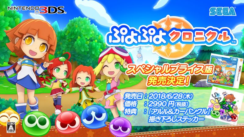 2016年12月に登場した「ぷよぷよ」シリーズのアクションパズルRPG、ニンテンドー3DS™用ソフト『ぷよぷよクロニクル』が、お求めやすい価格となったスペシャルプライス版として2018年6月28日(木)に発売することが決定いたしました。