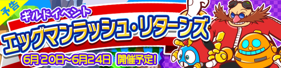 2018年6月20日(水)に予定しておりました、ギルドイベント「エッグマンラッシュ・リターンズ」ですが、都合により下記の開催日程に延期させていただきます。