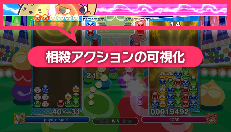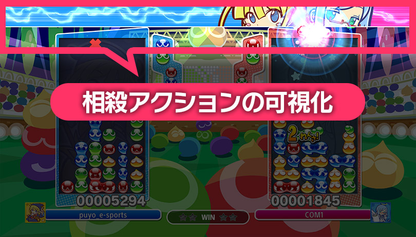 ゲームを盛り上げる要素として、相殺アクションを可視化して収録いたしました。「ぷよぷよ」の試合で勝つためには、連鎖を作り、おじゃまぷよを相手へ送り込むことが重要となってきます。予告おじゃまぷよが表示されている状態でぷよを消すと、消した数に応じて次に落ちてくる予定のおじゃまぷよの数を減らすことができることを「相殺」と言います。