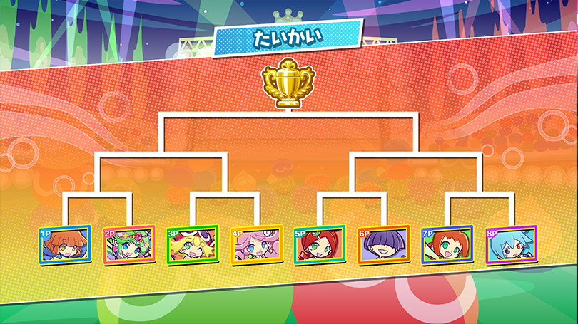 コントローラが2つあれば、オフライン・ローカル対戦で「たいかい」モードによるトーナメント対戦が可能です。最大8名まで参加することができます。