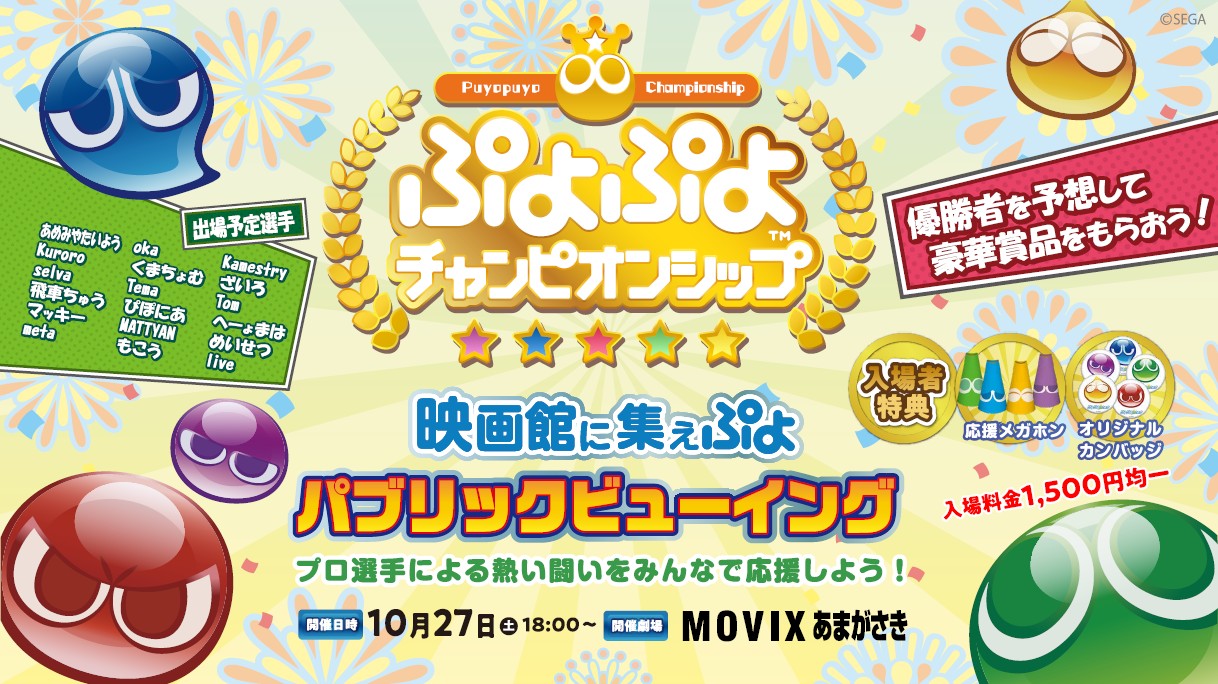 セガゲームス公式「ぷよぷよチャンピオンシップ」2018年度10月大会について、関西地域、兵庫県にある映画館「MOVIXあまがさき」で入場者特典付のパブリックビューイングイベントの開催が決定いたしました。