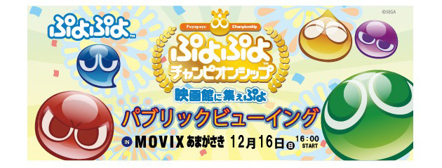 <セガゲームス公式「ぷよぷよチャンピオンシップ」2018年度12月大会>について、関西地域、兵庫県にある映画館「MOVIXあまがさき」で入場者特典付のパブリックビューイングイベントの開催が決定いたしました。パブリックビューイングイベントでは、大会会場からの中継放送が映画館の大画面でご覧いただけ、応援メガホン、オリジナル缶バッチをプレゼントいたします。