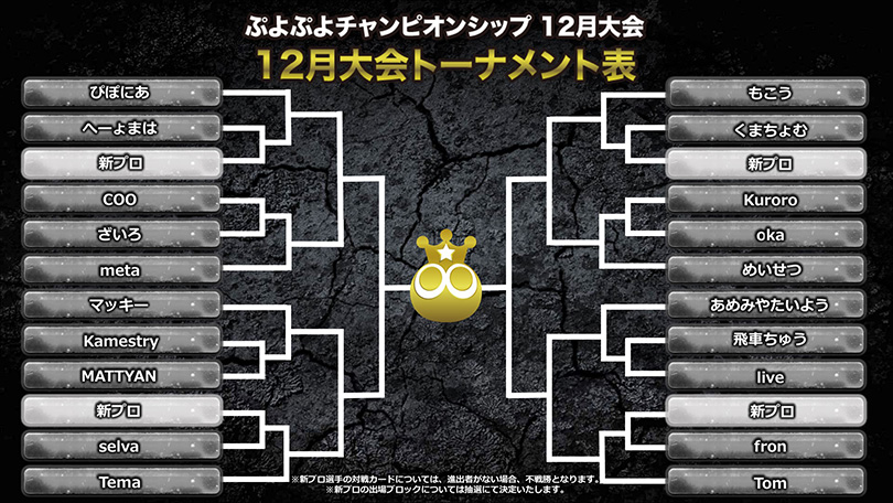 <「ぷよぷよチャンピオンシップ」2018年度12月大会>について、事前に抽選を行い、対戦カードを決定いたしました。前回10月大会優勝者の「くまちょむ選手」や、プロライセンスを取得したばかりの「coo選手」、「fron選手」の対戦カードなど、注目の組み合わせが目白押しです。