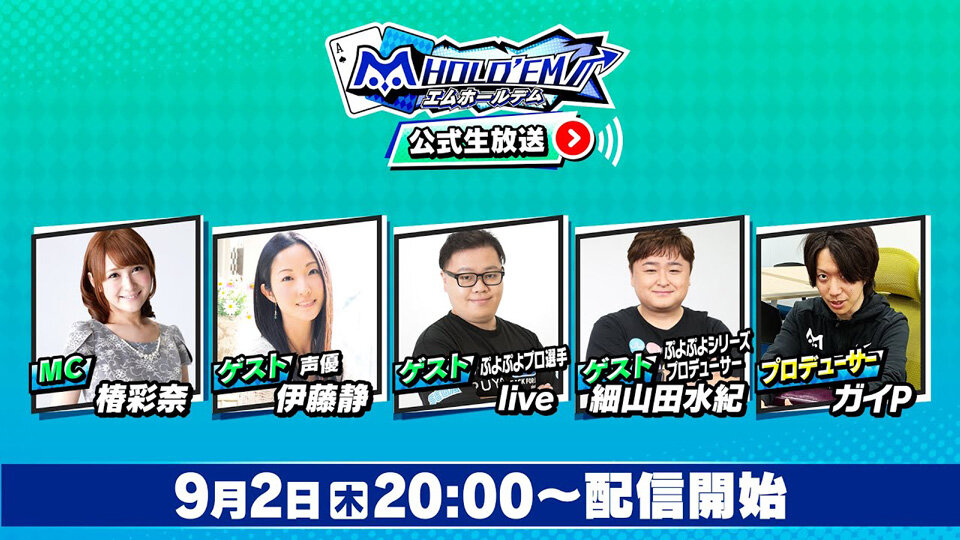 | 出演者 | 椿彩奈さん、伊藤静さん(声優)、live選手(ぷよぷよプロ選手)、細山田水紀(「ぷよぷよ」シリーズ総合プロデューサー)、ガイP(『m HOLD’EM 』 プロデューサー) |