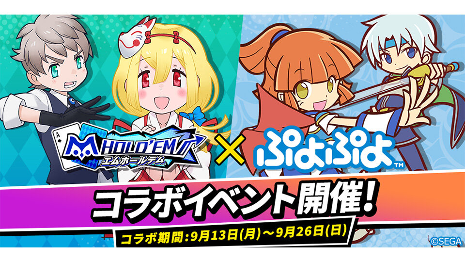 サミー株式会社のスマートフォン向けテキサスホールデムポーカーアプリ『m HOLD’EM(エムホールデム)』 と 「ぷよぷよ」とのコラボイベントを2021年9月13日から9月26日まで開催いたします。