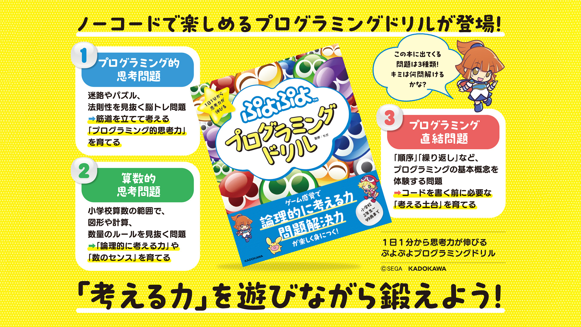 大人気パズルゲーム「ぷよぷよ」の世界観をそのままに、子どもの"ひらめき力"や"論理的に考える力"を楽しく育てる新しいドリルが誕生しました。