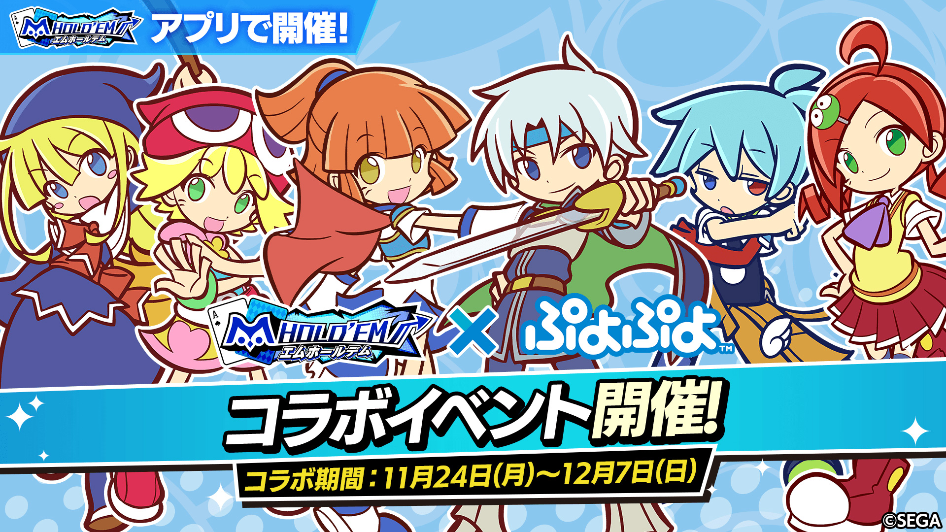 スマートフォン向けテキサスホールデムポーカーアプリ「m HOLD'EM(エムホールデム)」が、「ぷよぷよ」との復刻コラボイベントを2025年11月24日(月)から12月7日(日)まで、新衣装を追加実装して開催いたします。